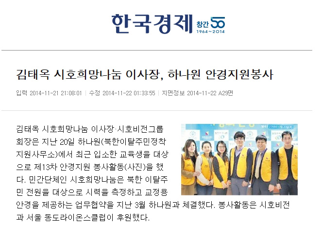 하나원 안경지원봉사 보도자료(2014.11.20)