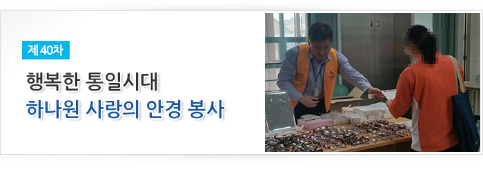 (사)통일희망나눔재단이 주관하고 시호비전그룹이 후원하여 2016년 4월 20일 하나원(북한이탈주민정착지원사무소)에서 입소 교육생 21명을 대상으로 제40차 안경지원 봉사활동을 실시하였습니다. 북한 이탈주민의 정착 지원 사업의 일환으로 밝은 빛을 되찾아 주기 위한 마음을 담아 2014년 3월 하나원과 시력 측정 및 교정용 안경을 제공하는 업무협약을 체결한 이래 정기적으로 안경 지원 봉사를 실천하고 있으며, 이번 행사에서는 시호비전 전문 안경사 4명이 개인별 검안 실시 후 7명에게 맞춤안경을 즉석에서 전달했습니다. 앞으로도 (사)통일희망나눔재단은 복지향상을 위한 다양한 복지나눔실천을 하도록 노력하겠습니다.