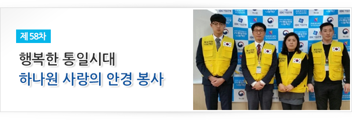 (사)통일희망나눔재단이 주관하고 시호비전그룹이 후원하여 2017년 2월 13일 하나원(북한이탈주민정착지원사무소)에서 입소 교육생 75명을 대상으로 제58차 안경지원 봉사활동을 실시하였습니다. 북한 이탈주민의 정착 지원 사업의 일환으로 밝은 빛을 되찾아 주기 위한 마음을 담아 2014년 3월 하나원과 시력 측정 및 교정용 안경을 제공하는 업무협약을 체결한 이래 정기적으로 안경 지원 봉사를 실천하고 있으며, 이번 행사에서는 시호비전 전문 안경사 4명이 개인별 검안 실시 후 28명에게 맞춤안경을 전달했습니다. 앞으로도 (사)통일희망나눔재단은 복지향상을 위한 다양한 복지나눔실천을 하도록 노력하겠습니다.