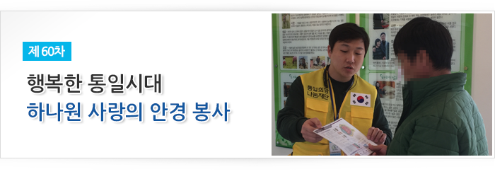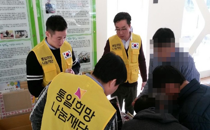 (사)통일희망나눔재단이 주관하고 시호비전그룹이 후원하여 2017년 3월 13일 하나원(북한이탈주민정착지원사무소)에서 입소 교육생 77명을 대상으로 제60차 안경지원 봉사활동을 실시하였습니다. 북한 이탈주민의 정착 지원 사업의 일환으로 밝은 빛을 되찾아 주기 위한 마음을 담아 2014년 3월 하나원과 시력 측정 및 교정용 안경을 제공하는 업무협약을 체결한 이래 정기적으로 안경 지원 봉사를 실천하고 있으며, 이번 행사에서는 시호비전 전문 안경사 3명이 개인별 검안 실시 후 23명에게 맞춤안경을 전달했습니다. 앞으로도 (사)통일희망나눔재단은 복지향상을 위한 다양한 복지나눔실천을 하도록 노력하겠습니다.