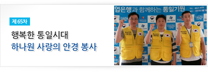 (사)통일희망나눔재단이 주관하고 시호비전그룹이 후원하여 2017년 6월 1일 하나원(북한이탈주민정착지원사무소)에서 입소 교육생 14명을 대상으로 제65차 안경지원 봉사활동을 실시하였습니다. 북한 이탈주민의 정착 지원 사업의 일환으로 밝은 빛을 되찾아 주기 위한 마음을 담아 2014년 3월 하나원과 시력 측정 및 교정용 안경을 제공하는 업무협약을 체결한 이래 정기적으로 안경 지원 봉사를 실천하고 있으며, 이번 행사에서는 시호비전 전문 안경사 3명이 개인별 검안 실시 후 4명에게 맞춤안경을 전달했습니다. 앞으로도 (사)통일희망나눔재단은 복지향상을 위한 다양한 복지나눔실천을 하도록 노력하겠습니다.