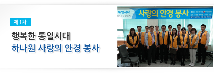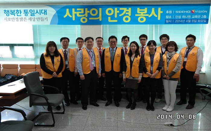 통일희망나눔재단이 주관하고 시호비전그룹이 후원하여 2014년 4월 08일 하나원(북한이탈주민정착지원사무소)에서 입소 교육생 242명을 대상으로 제 1차 안경지원 봉사활동을 실시했다.