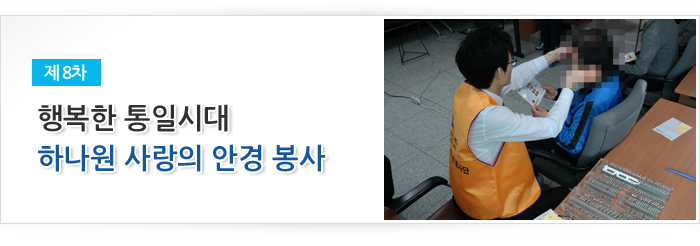 통일희망나눔재단이 주관하고 시호비전그룹이 후원하여 2014년 8월 21일 하나원(북한이탈주민정착지원사무소)에서 입소 교육생 94명을 대상으로 제 8차 안경지원 봉사활동을 실시했다.
