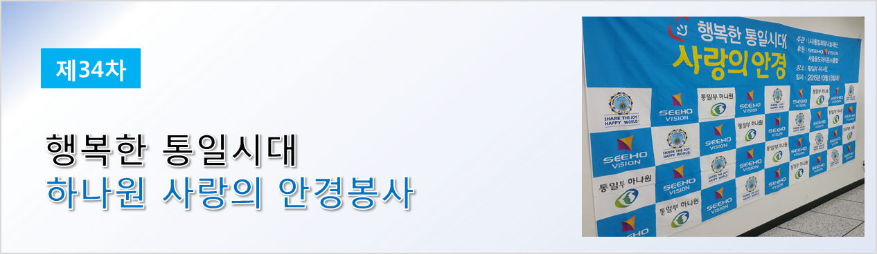 (사)통일희망나눔재단이 주관하고 시호비전그룹이 후원하여 2015년 12월 16일 하나원(북한이탈주민정착지원사무소)에서 입소 교육생 21명을 대상으로 제34차 안경지원 봉사활동을 실시하였습니다. 북한 이탈주민의 정착 지원 사업의 일환으로 밝은 빛을 되찾아 주기 위한 마음을 담아 2014년 3월 하나원과 시력 측정 및 교정용 안경을 제공하는 업무협약을 체결한 이래 정기적으로 안경 지원 봉사를 실천하고 있으며, 이번 행사에서는 시호비전 전문 안경사 3명이 개인별 검안 실시 후 11명에게 맞춤안경을 즉석에서 전달했습니다. 앞으로도 (사)통일희망나눔재단은 복지향상을 위한 다양한 복지나눔실천을 하도록 노력하겠습니다.