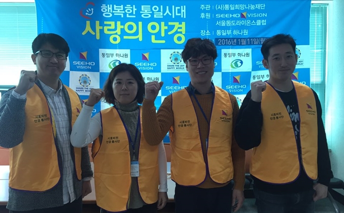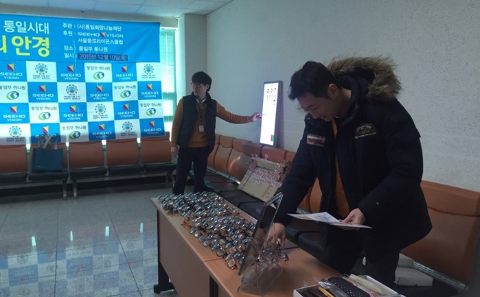(사)통일희망나눔재단이 주관하고 시호비전그룹이 후원하여 2016년 1월 11일 하나원(북한이탈주민정착지원사무소)에서 입소 교육생 76명을 대상으로 제35차 안경지원 봉사활동을 실시하였습니다. 북한 이탈주민의 정착 지원 사업의 일환으로 밝은 빛을 되찾아 주기 위한 마음을 담아 2014년 3월 하나원과 시력 측정 및 교정용 안경을 제공하는 업무협약을 체결한 이래 정기적으로 안경 지원 봉사를 실천하고 있으며, 이번 행사에서는 시호비전 전문 안경사 3명이 개인별 검안 실시 후 31명에게 맞춤안경을 즉석에서 전달했습니다. 앞으로도 (사)통일희망나눔재단은 복지향상을 위한 다양한 복지나눔실천을 하도록 노력하겠습니다.